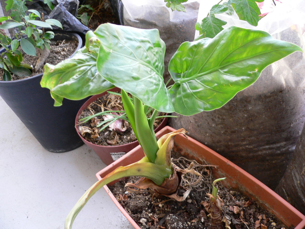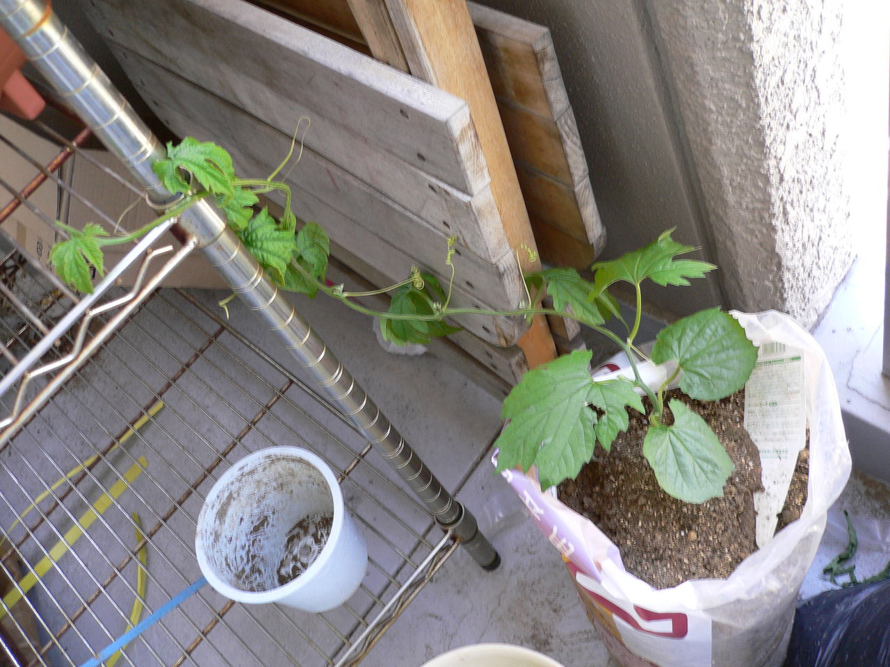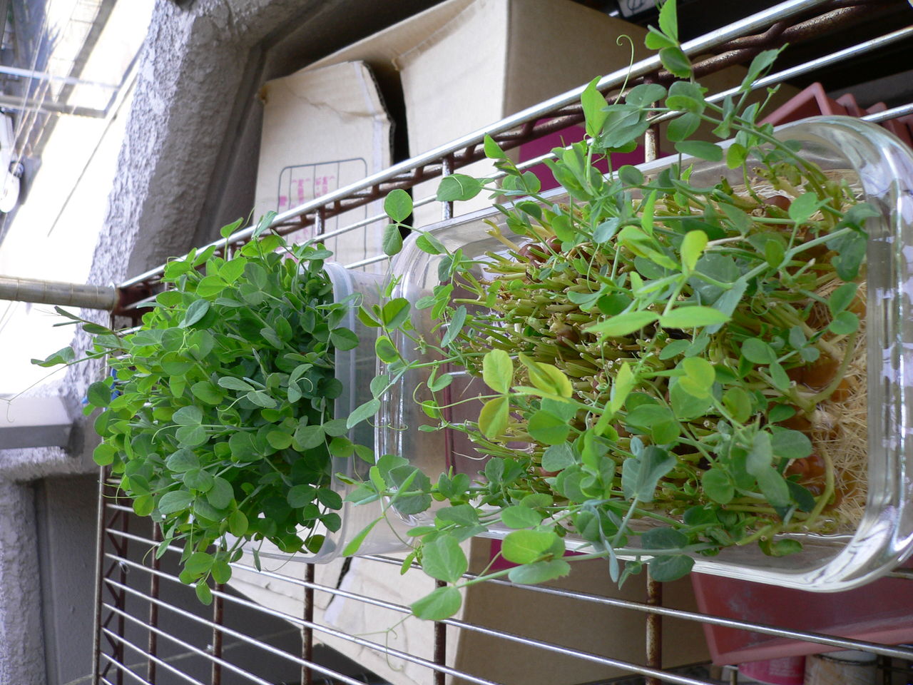 クワズイモ、ゴーヤ、豆苗がよく育っている